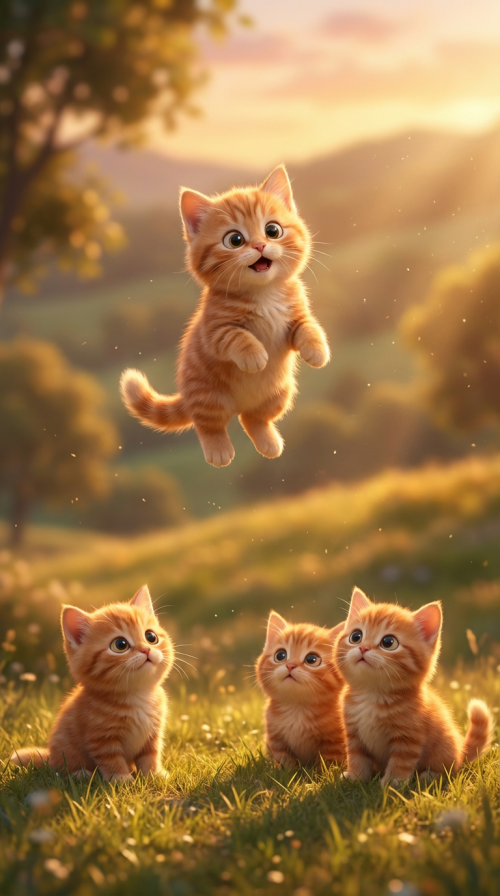a cute little orange cat is floating in the air, surrounded by three other orange kittens looking up at it curiously. the background features soft grass and warm tones, creating an adorable atmosphere. in the style of disney, in the style of pixar animati