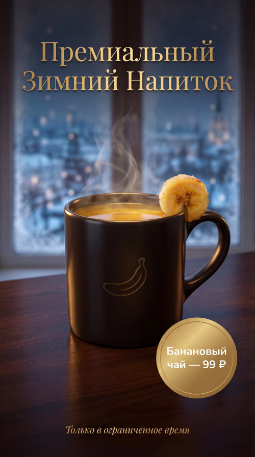 Design a luxury promotional poster for an upscale winter beverage brand. Composition: A cinematic, high-end close-up of a steaming mug of premium hot banana tea on a dark polished wooden table. The drink glows with a warm, golden-banana hue, as if infuse