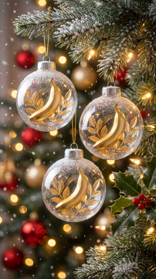 Three white Christmas ornaments with transparent glass hanging from the tree. Each glass Christmas ornament contains a small, elegant golden banana inside — styled as a festive decorative element. The ornaments are snow-covered, hanging against a Christma