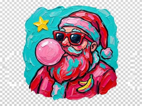 Santa Claus blowing bubblegum, big red sunglasses, cute cartoon style. Thick impasto oil paint, heavy palette-knife texture, strong black outlines, glossy highlights, vibrant red-pink-turquoise color palette, chunky 3D paint strokes. Irregular painted bac