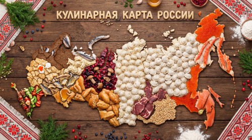 Create a map of Russia with each region made from its most famous food (the region should look like it s made from the food, not like a picture of it). Double-check that each region is accurate.
